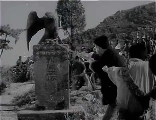 十年后,虎岭镇解放,当地百姓们群情激奋,一起将铸造的鹰碑拉到,将鹰坟挖开平掉,却发现坟墓中埋的根本不是鹰,竟是两具森森白骨——被张家地主杀害的吕明松和胡庆奎。