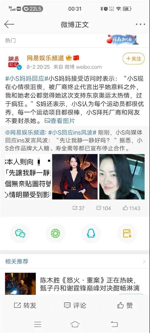 同样都是港台明星,看看小S,再看看佘诗曼在外网上是如何支持中国奥运健儿的……