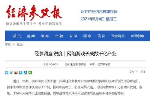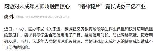 说回本文的主题。8月3日早上,《经济参考报》刊登了一篇题为《网游对未成年人影响触目惊心 “精神鸦片”竟长成数千亿产业》的记者调查,矛头直指那几家游戏产业巨头,腾讯、网易、三七互娱、中手游等巨头的股价应声暴跌。