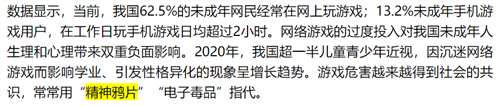 数据显示,当前,我国62.5%的未成年网民经常在网上玩游戏;13.2%未成年手机游戏用户,在工作日玩手机游戏日均超过2小时。网络游戏的过度投入对我国未成年人生理和心理带来双重负面影响。2020年,我国超一半儿童青少年近视,因沉迷网络游戏而影响学业、引发性格异化的现象呈增长趋势,网络游戏危害越来越得到社会的共识。