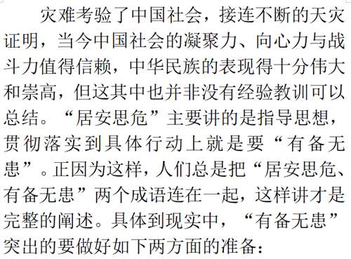 要做到这一点,必须把思想工作做在前面,在和平时期就要大力加强爱国主义集体主义教育,让家国大局观念深入人心,让天下匹夫之责贯彻到每个人头上,尽管个别人总有,实话实说也难以杜绝,但这并不能成为放松思想教育的理由与托词,也正因如此,精神准备就越发显得格外重要。