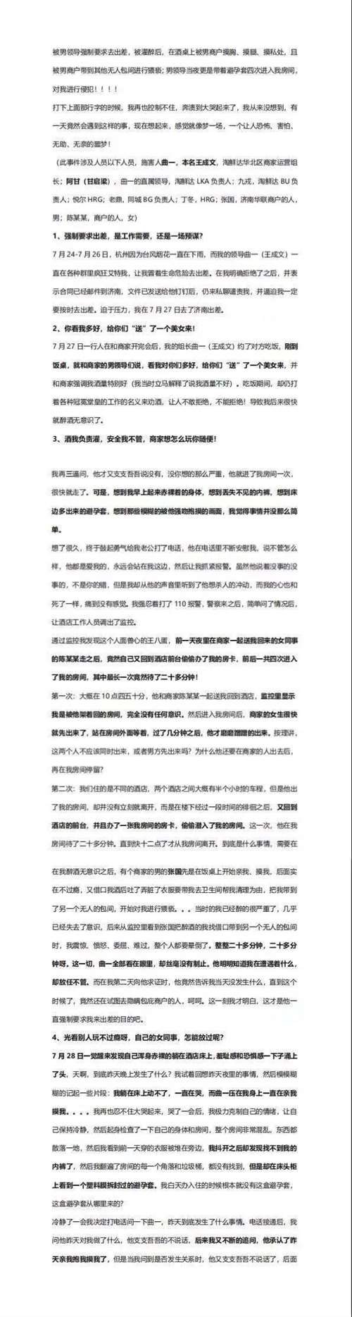 举报阿里的女员工称,自己被男领导强制要求去出差,期间被灌醉,然后在酒桌上被男客户摸胸,摸腿,摸私处,随后男客户把她带到其他无人包间进行猥亵。除了男客户,男领导当夜带着避孕套去女下属房间,一共四次,对她进行侵犯。