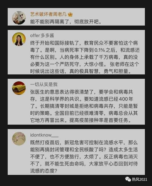 “张文宏说:‘未来中国选择的方式一定是既保证与世界的命运共同体,实现与世界的互通,回归正常的生活,同时又能保障国民免于对病毒的恐惧。中国应该有这样的智慧。’”