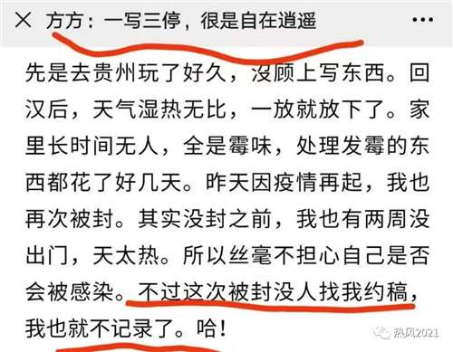 方方最新文章中,自己就招供,说什么:“没顾上写东西”,“不过这次被封没人找我约稿,我也就不记录了。哈!”