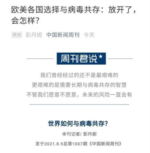 中国新闻周刊直接来了一篇《欧美各国选择与病毒共存:放开了,会怎样?》,其大意就一个,好像也没怎么样。