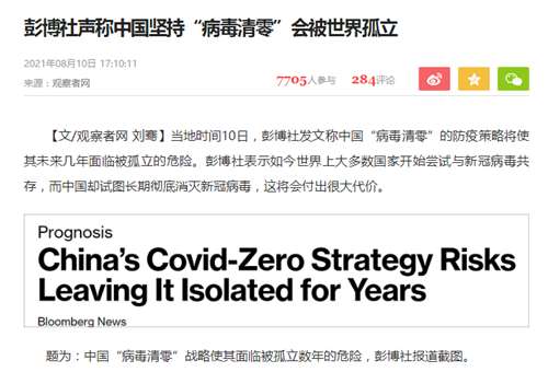8月10日,美国的彭博社发文称:中国“病毒清零”的防疫策略将使其未来几年面临被孤立的危险。彭博社认为如今世界上大多数国家开始尝试与新冠病毒共存,而中国却试图长期彻底消灭新冠病毒,这将会付出很大代价。