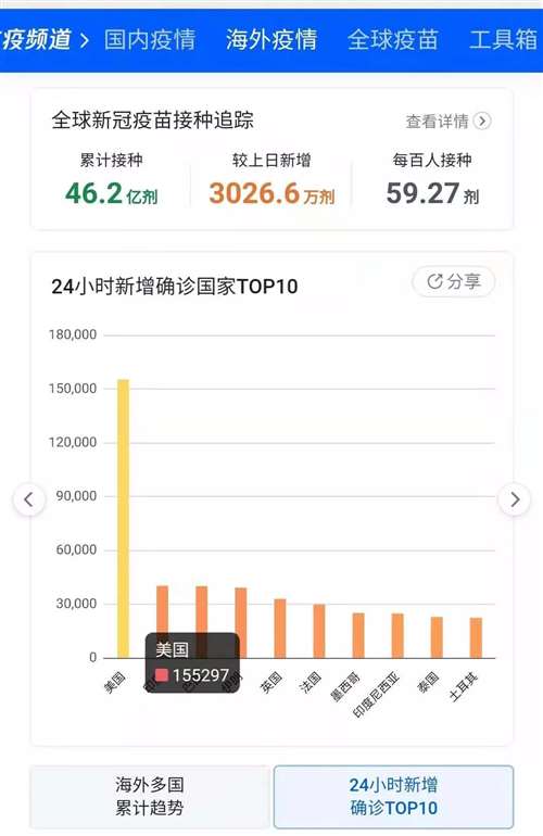 在国外,疫苗的接种也完全没能阻止变异病毒的肆虐。截止2021年8月14日,最近24小时新增最多的国家美国,又感染了155297人!