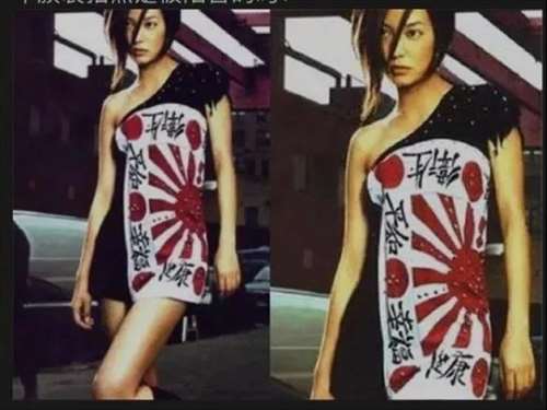 上面这位是家喻户晓的“明星”,穿着日本军旗服走秀。日军的军旗啊,那是屠杀中国军民的旗帜。这人除了遭到网民谴责,也是毫发无损。我想,与江西那个立场爱国的老师发了一条言论不当的微博被行拘15天相比,这种媚日行为刑拘30天也不为过吧。可是,没有。至今还和资本大亨打得火热。