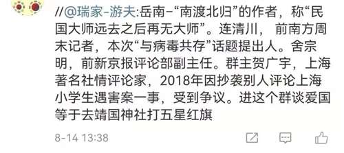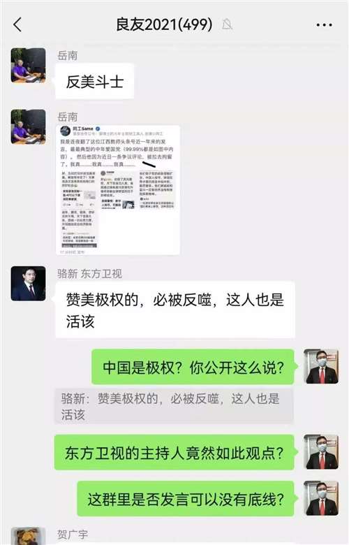 “ 昨天晚上,在某个名流群里,一些公知在口嗨,其中岳南晒了一张图片,显示那位被行政处罚的江西教师近一年来的言论,基本上都是爱国的,只因为最新那条有争议,被拘留了。东方卫视主持人骆新对此评论了一句:“赞美极权的,必被反噬,这人也是活该”。结合上下文,这意思非常明确,他认为爱国等于赞美极权。于是我反问了他一句:“中国是极权?你公开这么说?”群主贺广宇就出来指责我,要我包容所有的观点,并发了一个所谓的言论自由的群规。我就反问他,那“包容所有的观点,是否就可以没有基本的底线?”接下去,佘宗明、薛荣民、连清川、谢良兵等人一哄而上,纷纷维护骆新。有人说我曲解,有人说我罗织罪名 ,有人说我不包容,最后群主把我踢出了群。也就是说,他们可以包容说“爱国=赞美极权”的人,但不能包容我这样提出不同意见的人。”