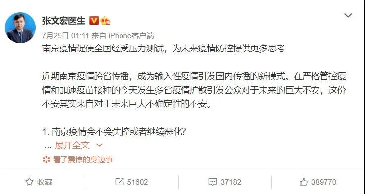 7月29日,著名网红专家张文宏先生在新浪微博发表了题为《南京疫情促使全国经受压力测试,为未来疫情防控提供更多思考》的文章称:“我们曾经经过的还不是最艰难的,更艰难的事需要长期与病毒共存的智慧。”