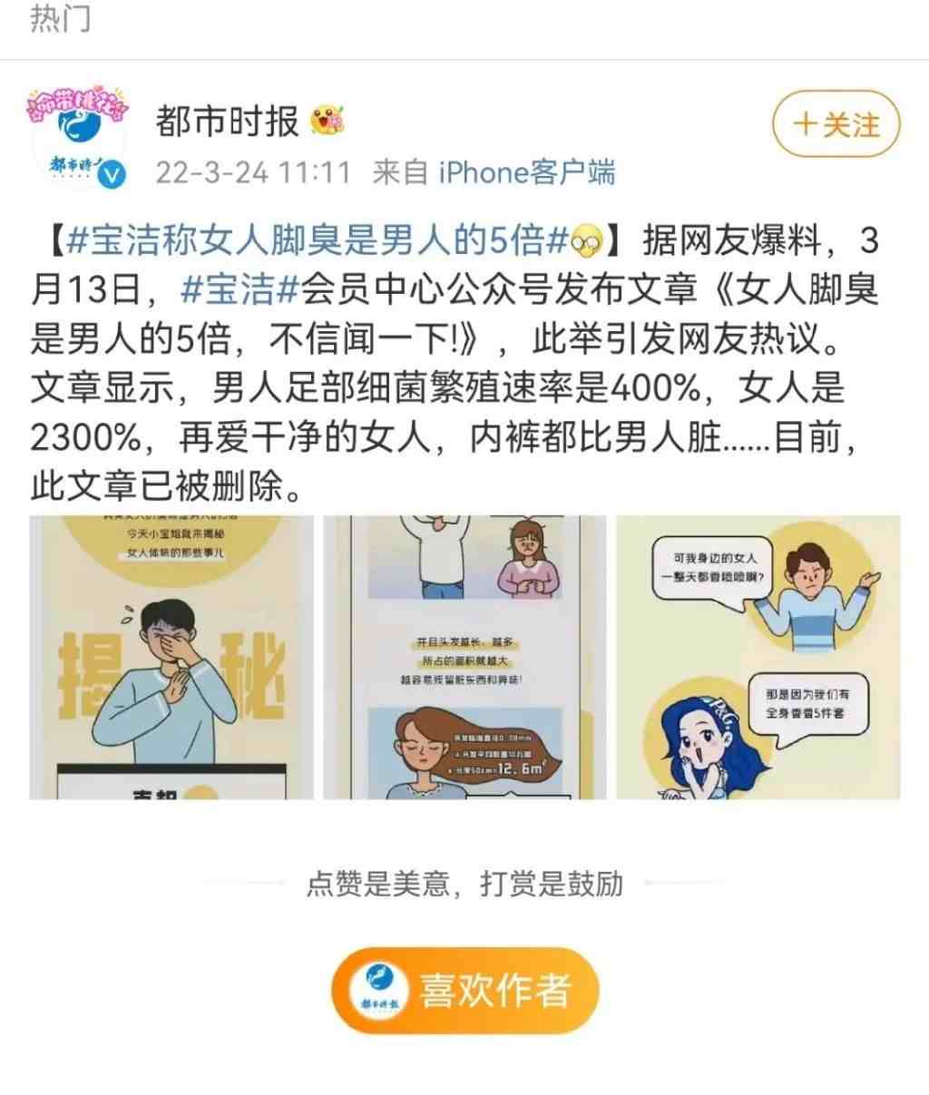 今天,@宝洁中国 就旗下微信公众号文章《女人脚臭是男人的5倍?不信现在闻一下!》被指侮辱女性回应称:为文章不当内容对女性的不尊重郑重道歉,目前已删除这篇文章并严肃整顿该账号的运营。
