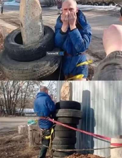 在哈尔科夫,一个轮胎店老板因为拒绝为纳粹免费服务,就被他们绑在轮胎上羞辱。