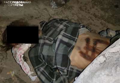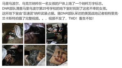 在清扫马里乌波尔战场的时候,顿巴斯民兵一个设在学校的地下室的亚速据点里,发现了一具被虐杀的女孩遗体。女孩的一条胳膊被扯断,她的头上有一个塑料袋或胶带缠绕的残留物,她的腹部被烧上了一个纳粹“逆万字符”标志。