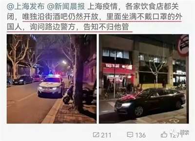 疫情之下,上海人都在执行居家隔离政策之时,沿海街酒吧拒不执行餐饮停业的规定,仍开门营业,里面坐满了不戴口罩的外国人。记者询问路边警察,告知不归他管。不遵从主权国家的政策法规,不存在什么外宾,只是一堆危害公共安全的洋垃圾。不行使警察的维护社会安全的权力义务,不是什么人民警察,只是一具没有灵魂的行尸走肉。