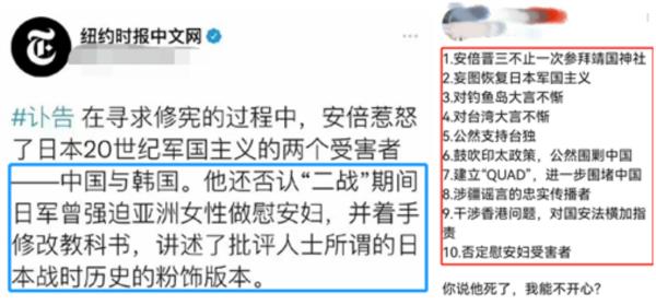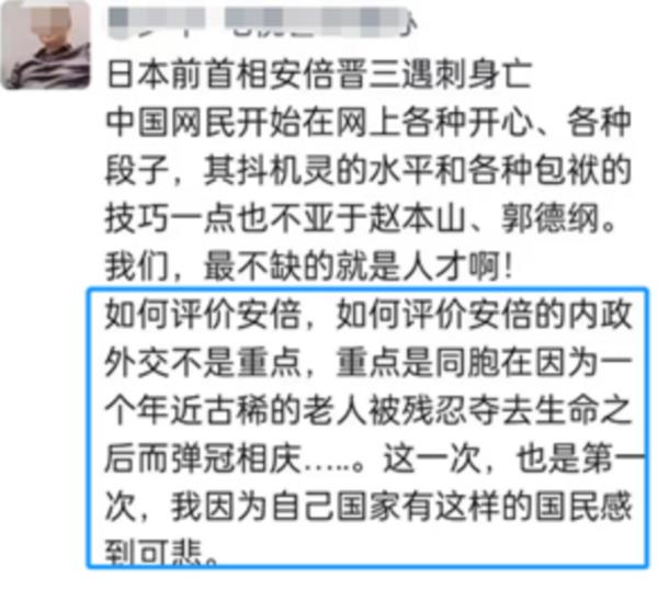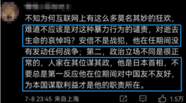 有人说,安倍的内政外交不是重点,重点是“同胞在因为一个年近古稀的老人被残忍夺去生命之后而弹冠相庆”。或许,此人该补补历史了,当年,两颗蘑菇蛋夺走了十几万日本人的生命,全世界可都高兴坏了,现在安倍死了,我们高兴高兴咋了?恕我直言,我巴不得日本拜过鬼的政客全都原地去世,那种人类的渣滓死多少我都不会心疼。你为我感到“可悲”,我还为你感到可耻呢。