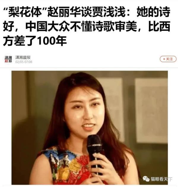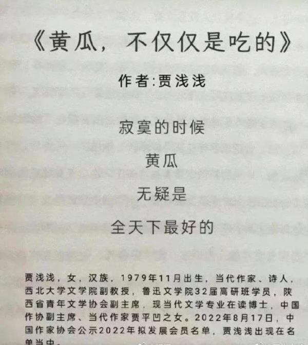 这位贾浅浅何许人也?看看她的情况:中国作协副主席之女,西北大学文学院副教授、陕西省青年文学协会副主席,多篇大作在《青年文学》、《北京文学》等发表,还曾出版3册诗集,荣膺2019名人堂年度十大诗人的称号,有网友亲切地赠送“屎尿体诗歌创始人”的美誉。