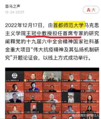 仔细查看这则消息的图片,一帮由首都师范大学某一学院教授领衔,并作为首席专家,更有中国人民大学、北京师范大学、北京中医药大学等等学校的专家教授,在全国都在为治疗感染患者忙忙碌碌、出谋划策的时候,这帮不下基层,不做调研、不到一线医院的教授,却在轰轰烈烈地举行线上一场“疫情还没结束”就要“歌颂丰功伟绩”的开题论证会。这还仅仅是“开题”论证会,字面理解难道后面还有更多名义论证会吗?原谅我的认知水平,实在是限制了我的想象力。