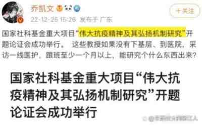 全国各地新冠感染者激增,医院发热门诊人满为患、药店排起长队购买体温计、退烧药更是一粒难求。每天各种不好的消息充斥着网络,每个国人都焦虑不安。当大家都在为疫情爆发焦头乱额的时候,今天看到的一则消息让人难以置信。拥有200多万粉丝的乔凯文博主爆料:有个国家社科基金重大项目,叫:“伟大抗疫精神及其弘扬机制研究”开题论证会成功举行。