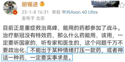 胡锡进先生这话说的漂亮,但之前网上对连花清瘟喊打喊杀的声音多的是,把辉瑞神话成“特效药”的声音就更屡见不鲜,要不然我那些朋友,以及朋友的朋友为何会对辉瑞那么信赖?恕我直言,这恐怕与之前有人对辉瑞的“神话”有很大关系吧?现在网络上对辉瑞质疑的声音多了,胡锡进先生站出来“打抱不平”要求“实事求是”,表面不偏不倚,但给人的感觉多少有点怪怪的。或许是我孤陋寡闻吧,以前我怎么没见胡锡进先生在这个问题上态度如此鲜明过呢?