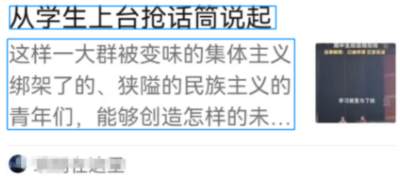 昨天,有朋友给我推荐了篇《从学生上台抢话筒说起》的文章,内容如何先不提,光看导语就够吓人的了,陈宏友没错,错的是学生,看看此人给学生扣的“被变味的集体主义绑架了的、狭隘的民族主义的青年”的大帽子,就问你怕不怕吧。实话实说,与公知斗智斗勇多年,我以为我早就习惯了公知的恶毒,但很明显,公知的恶毒是没有下限的。