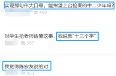 还有“对学生抢老师话筒这件事,我说就‘十三个字’”,这“十三个字”是“可以理解,不应鼓励,不急于处理”,看似“理中客”,实则同样避重就轻,还请此人翻译翻译什么叫“可以理解”,是理解陈宏友向学生灌输的“金钱至上”的观念,还是理解他向孩子传授的“杂交优势”的“理论”呢?至于说“我觉得陈宏友说得对”的,我实在无力吐槽了,对、对、对,你全家都对。