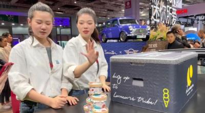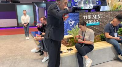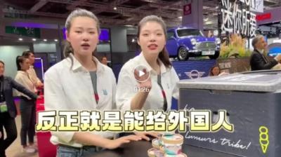 MINI展台的工作人员一改先前的态度,不仅热情地介绍起来,还慷慨地从箱子里拿出一盒冰淇淋递给了老外。