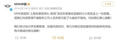 “MINI发起的‘上海车展现场礼-甜宠’活动本意是给逛展的大小朋友送上一份甜蜜。因我们内部管理不细致和工作人员失职引起了大家的不愉快。对此我们真心道歉!
