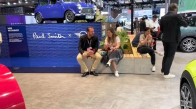 到了这里,视频拍摄者又把镜头转向另一边,几名老外在休息区惬意地吃着冰淇淋,他们的身后是明晃晃的MINI标志。