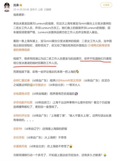 后来这人又重新编辑了这条微博,改口说两名工作人员是宝马找来发冰淇淋的临时工。