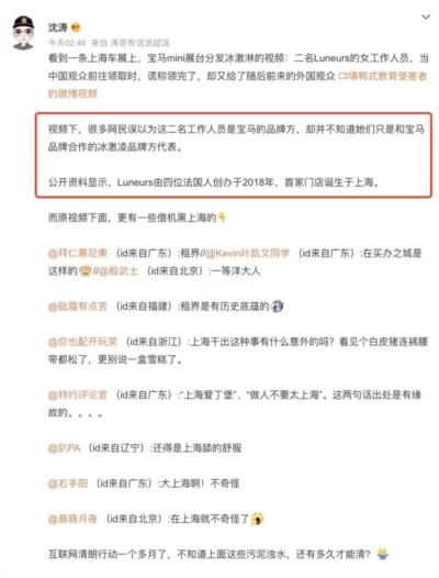 有网友直呼:“宝马家在中国,但中国人不配吃冰淇淋!”