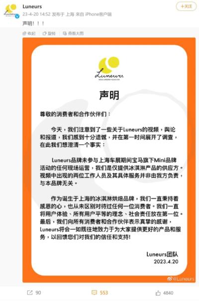 冰淇淋品牌方@Luneurs 公开与宝马割席,说他们未参与MINI品牌的任何现场运营活动,他们只是提供了冰淇淋,至于视频中出现的两名工作人员,也完全和他们没关系。