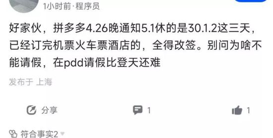 看到临时的调休通知,有员工对此表示,已经订完的机票火车票酒店需要全部改签,因为在拼多多请假比登天还难!