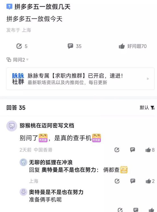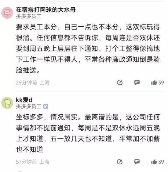 由于拼多多一直采用单休制度,所以休假的安排与国家的有“亿点”区别。早前就有人询问拼多多五一放假几天,员工的答复都是“不知道”,并且表示“HR还会查手机,不敢乱说话”。