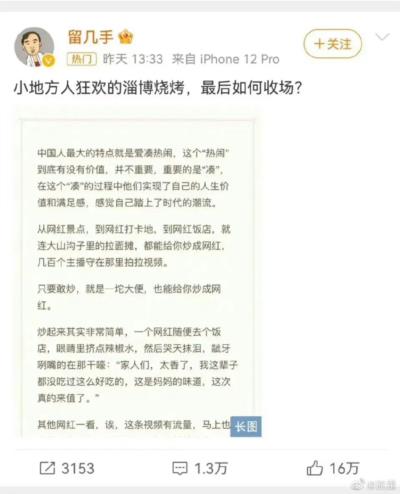 这两天见过最荒唐的事情,就是各路过气媒体人、财经媒体、公知大V对淄博烧烤口诛笔伐,似乎人民群众吃个烧烤,就“国将不国”了一样。