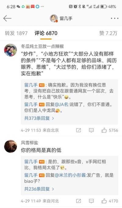 最可笑的是某媒体人“留几手”,明明当年只是个炒作娱乐圈恶俗新闻的自媒体,忽然跳出来装高级的上流人士了……我不是说娱乐媒体就低俗,而是说这种明明是下九流,却要标榜自己审美高雅、格调高级、卓尔不群……这就低俗又下流了。