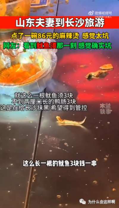 就在淄博烧烤众口称赞的时候,长沙也出现一件比较火的事情,一个游客去到长沙,点了一碗麻辣烫,竟然要收86块钱,一棵比面条粗不了多少的鱿鱼须子,要收山东游客三块钱。