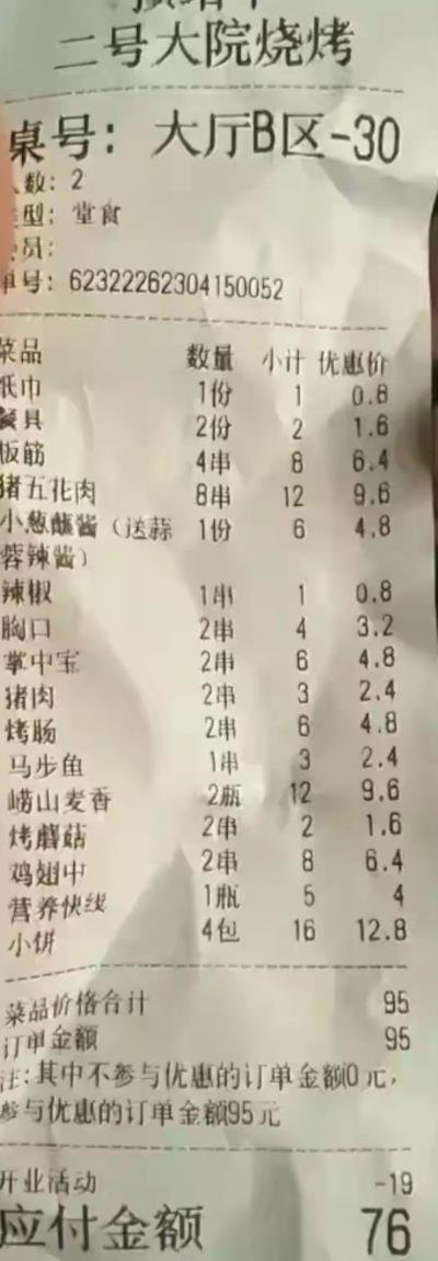 结果2个人在临淄吃烧烤,总共才花了76元。