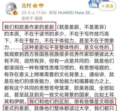 由此,笔者忽然想到最近刚刚看到过的作家北村在某不厚平台上的发言。咱们一起看看这位《周渔的火车》作者都写了些什么: