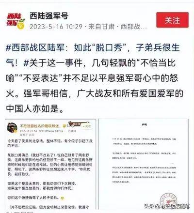 中国人民解放军的荣誉和威严受到挑战了吗?人民群众觉得受到了,不仅人民群众觉得,有关部门和官方媒体也这样觉得,甚至人民军队自己也觉得。西部战区陆军甚至表示:“如此‘脱口秀’,子弟兵很生气!#关于这一事件,几句轻飘的‘不恰当比喻’‘不妥表达’并不足以平息强军哥心中的怒火。强军哥相信,广大战友和所有爱国爱军的中国人亦如是!”
