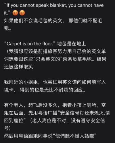 注意一下,很多报道里说的都是“国泰航空歧视非英语乘客”。实际上,如果你说的是法语、德语,甚至俄语,她们都不一定会歧视……因为这些人歧视的根本不是“非英语乘客”,她们所歧视的就是单纯的“中文乘客”。