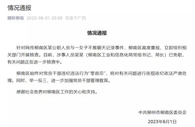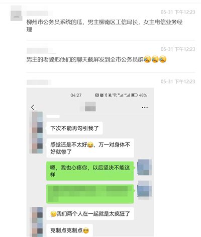 “柳南区工业和信息化局局长与一女性电信业务经理出轨,局长老婆发现后把两人聊天截屏发到全市公务员群”。5月31日,柳州市的这个“雷”爆得真大真响,不知道柳州市有多少公务员忙着查看手机,忙着删除聊天记录;不知道全国有多少官场职场丈夫的妻子们勒令他们的夫君交出手机、审查手机;不知道有多少市县乡的纪委监委紧盯着网络,担心他们那儿的什么什么局、什么什么长的老婆发截图;不知道有多少书记、市长、区长坐不安稳,担心什么什么局的局长变道出轨,给县里办难看,给市长出难道。