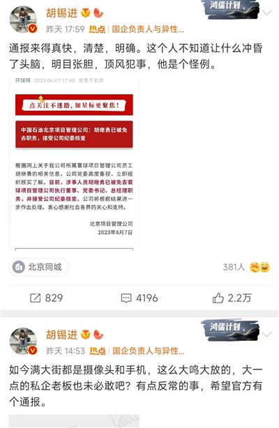 与之同时,中石油胡某勇的事,意外地又把“北极鲶鱼”送上了热搜: