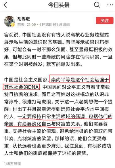 在全民吃瓜、“神”、“兔”都要上来踩一脚的风口浪尖,老胡依然坚持己见,颇为不易。老胡曾经无数次地公开劝谏官员和富人们要“低调”,要锦衣夜行: