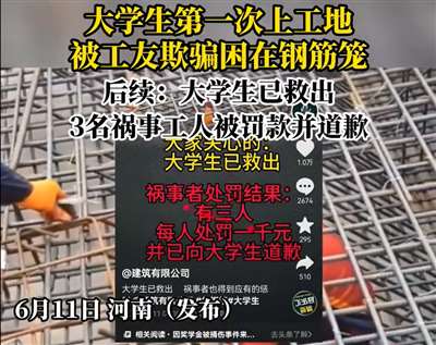 昨天看到一则新闻:一名大学生第一天上工地打工,遭到工友戏耍被骗到下面扎钢筋,结果被困在钢筋笼里无法脱身。