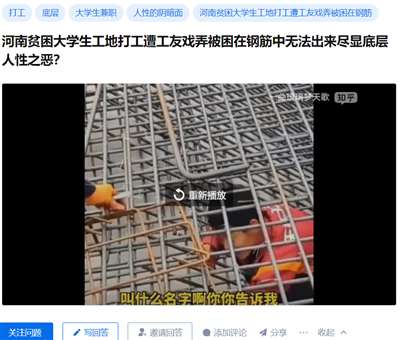知乎上有人就这则新闻开出了一条问题:“河南贫困大学生工地打工遭工友戏弄被困在钢筋中无法出来尽显底层人性之恶?”