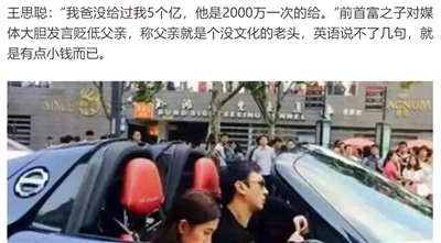 而前首富家的王公子则说,“我爸没给过我5个亿,一次性只给个几百万、几千万的小钱”……