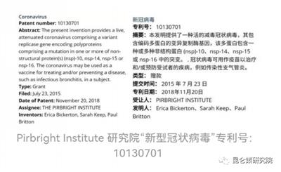 英国皮尔布莱特研究院(Pirbright Institute)的布里奇教授,也是在盖茨基金会的忽悠资助下,以开发艾滋病疫苗的名义完成了新冠病毒部分基因片段的组装工作。也就是将SARS非典病毒与动物冠状病毒进行基因融合。布里奇本意是希望研制一种能被肺部吸入的艾滋病疫苗。布里奇教授选择了高致病性的SARS非典病毒和高传染性的动物冠状病毒进行融合。他设想这样开发出来的合成基因病毒将兼顾高致病性和高传染性,将这种转基因病毒灭活后制造的疫苗能迅速扩散全球。布里奇教授的团队最终开发出了冠状病毒和非典SARS病毒的病毒基因重组体,并将其命名为 “SARS-Like”。并由皮尔布莱特研究院申请而获得专利。名字叫“新型冠状病毒”。皮尔研究院研发并申请这种重组体专利的初心,只是想垄断制备艾滋疫苗的方法。而其共同发明者有:美国国防部高级研究计划局(DARPA)、比尔和梅林达·盖茨(Bill and Melinda Gates)基金会。虽然该病毒被命名为“新型冠状病毒”,但这与现在的新冠病毒covid-19不是同一个病毒,这只是真正新冠病毒 covid-19 的半成品。但皮尔布莱特研究院并不知晓未来出现的新冠病毒covid-19的全貌,他只是在不知情的情况下,参与研制新冠病毒covid-19这一基因生物武器工程的一部分分包工作。
