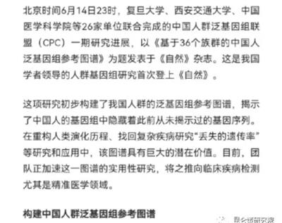 6月14日消息,中国泛基因组联盟(Chinese Pangenome Consortium,CPC)发表了中国36个民族的泛基因组参考图谱——CPC序列。由复旦大学徐书华教授、金力院士、西交大叶凯联合中国医学科学院共26个单位,组成的中国人群泛基因组联盟(CPC)。构建了高质量、高精度能代表中华民族遗传多样性的中国人群泛基因组图谱。并在知名《自然》杂志上发表《基于36个族群的中国人泛基因组参考图谱(A pangenome reference of 36 Chinese populations)》论文,并称“揭示了中国人基因中隐藏的从未揭示过的基因序列”。