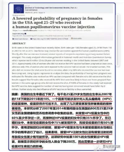 附:美国学者震惊论文《美国25-29岁女性中接受HPV疫苗注射女性怀孕概率降低25%!》