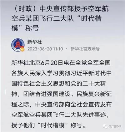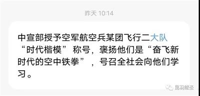 6月20日,几乎所有人都收到了一条运营商群发的短消息,内容是授予空军航空兵某团飞行二大队“时代楷模”称号,褒扬他们是“奋飞新时代的空中铁拳”,号召全社会向他们学习。